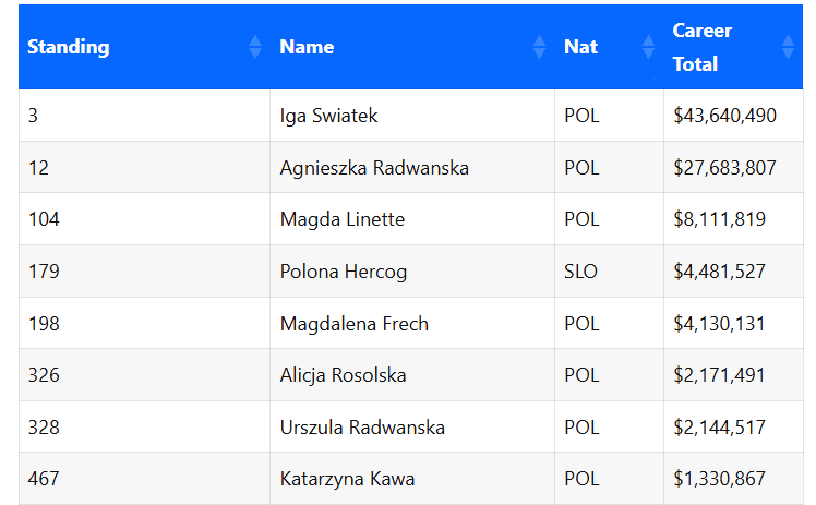 Na 198. miejscu jest Magdalena Fręch – 4 130 131 dolarów, a na 326. i 328. Alicja Rosolska i Urszula Radwańska, kolejno z zarobkami rzędu 2 171 491 i 2 144 517 dolarów. Natomiast na 457. znajduje się Katarzyna Kawa z kwotą 1 330 867 dolarów.